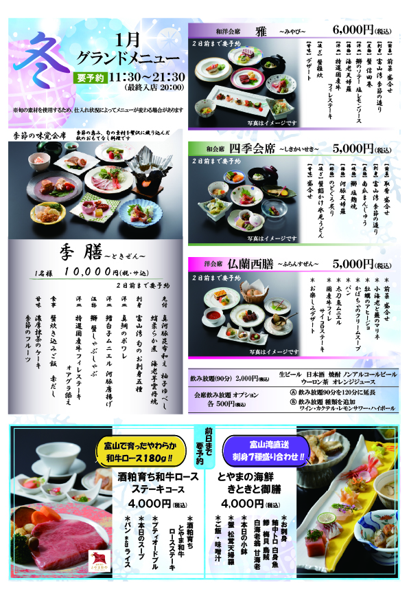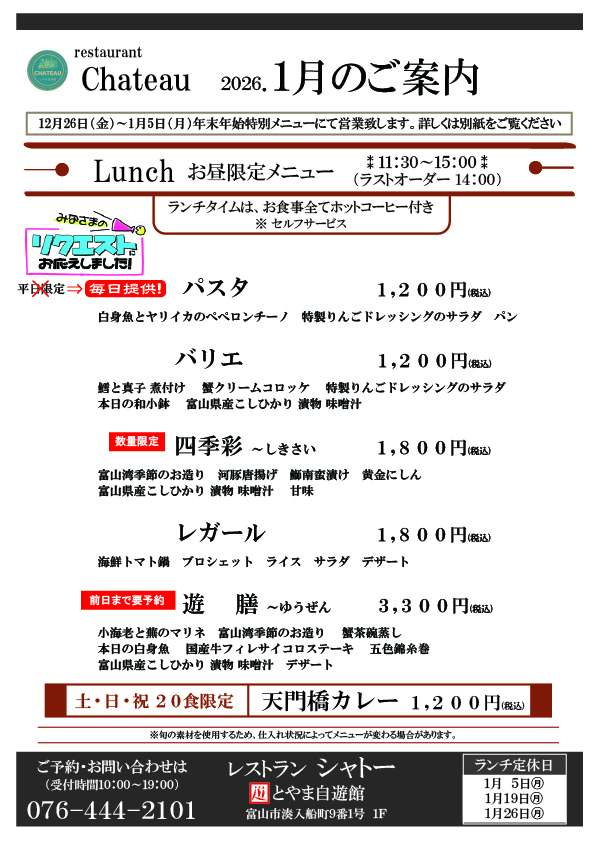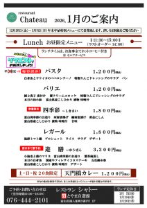 1月は、5日(月)・19日(月)・26日(月)のランチタイムがお休みです。