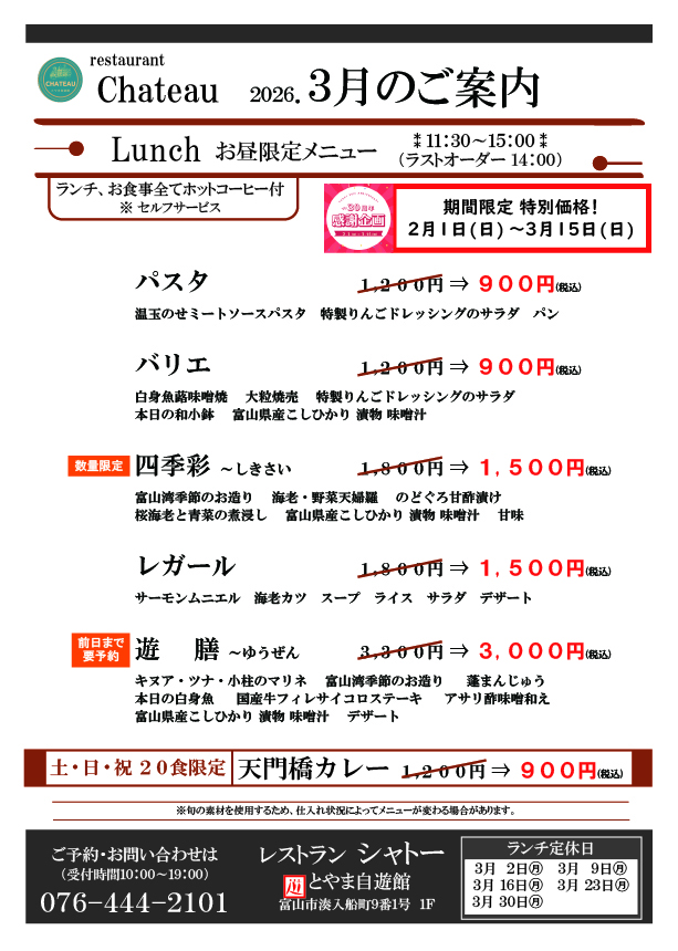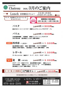 3月は、2日(月)・9日(月)・16日(月)・23日(月)・30日(月)のランチタイムがお休みです。