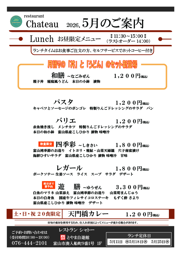ランチタイム 11時30分 ~ 15時00分 (ラストオーダー14時00分)